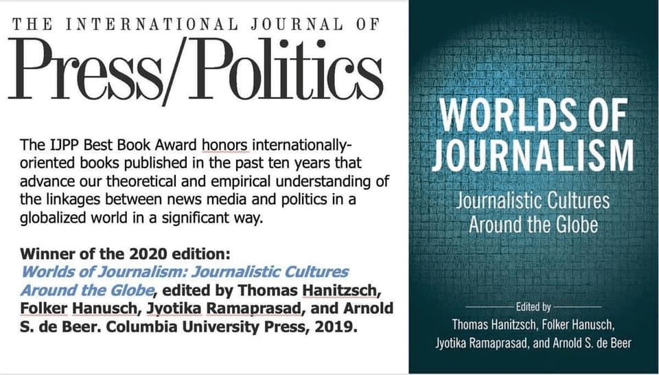 The IJPP Best Book Award was this year for the book «Worlds of Journalism. Journalistic Cultures Around the Globe», edited by Thomas Hanitzsch, Folker Hanusch, Jyotika Ramaprasad, and Arnold S. de Beer. In this book I have the honor to participate as coauthor in two chapters: