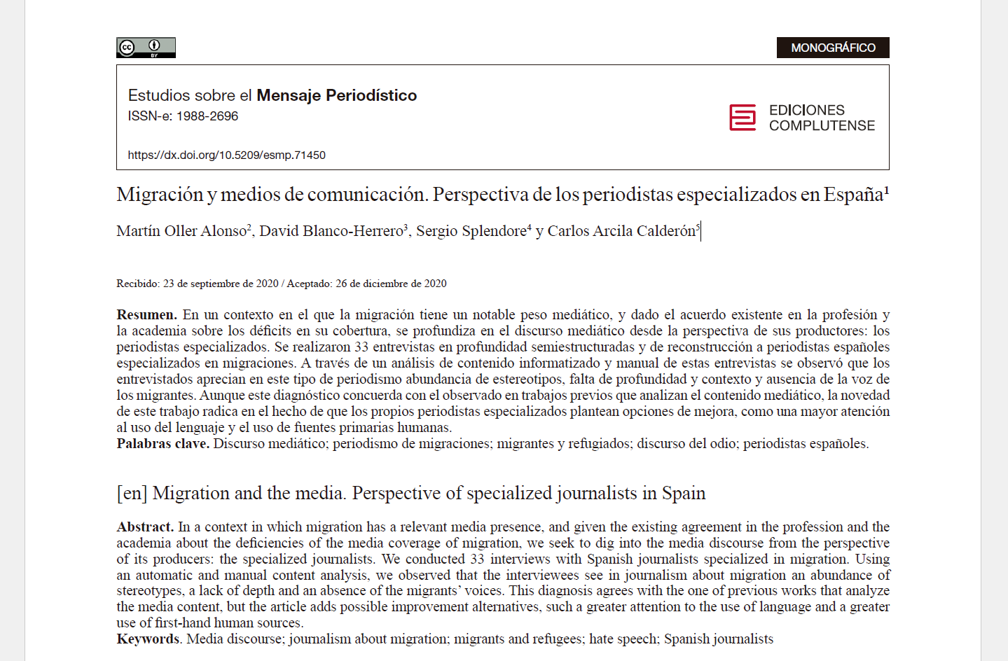 El artículo «Migración y medios de comunicación. Perspectiva de los periodistas especializados en España» ha sido publicado en la revista Estudios Sobre el Mensaje Periodístico junto a David Blanco-Herrero (Universidad de Salamanca), Sergio Splendore (UNIMI) y Carlos Arcila Calderón (Universidad de Salamanca).