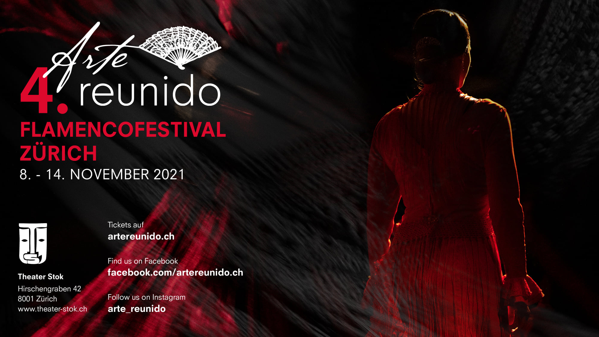 Es ist uns eine grosse Freude euch hiermit das Festivalprogramm unserer 4. Edition vorstellen zu können!Arte reunido wurde wegen der Pandemie zweimal verschoben. Nun freuen wir uns umso mehr, dass wir im November 2021 wieder vor Publikum spielen und die Schweizer Flamencoszene sicht- und erlebbar machen können. Neu wird die Festivalwoche mit einem Streaming ergänzt, womit Arte reunido einmal mehr zu einem unvergesslichen Erlebnis für Dich und Deine Familie werden soll, ob live vor Ort im Theater Stok oder bequem von zu Hause aus!