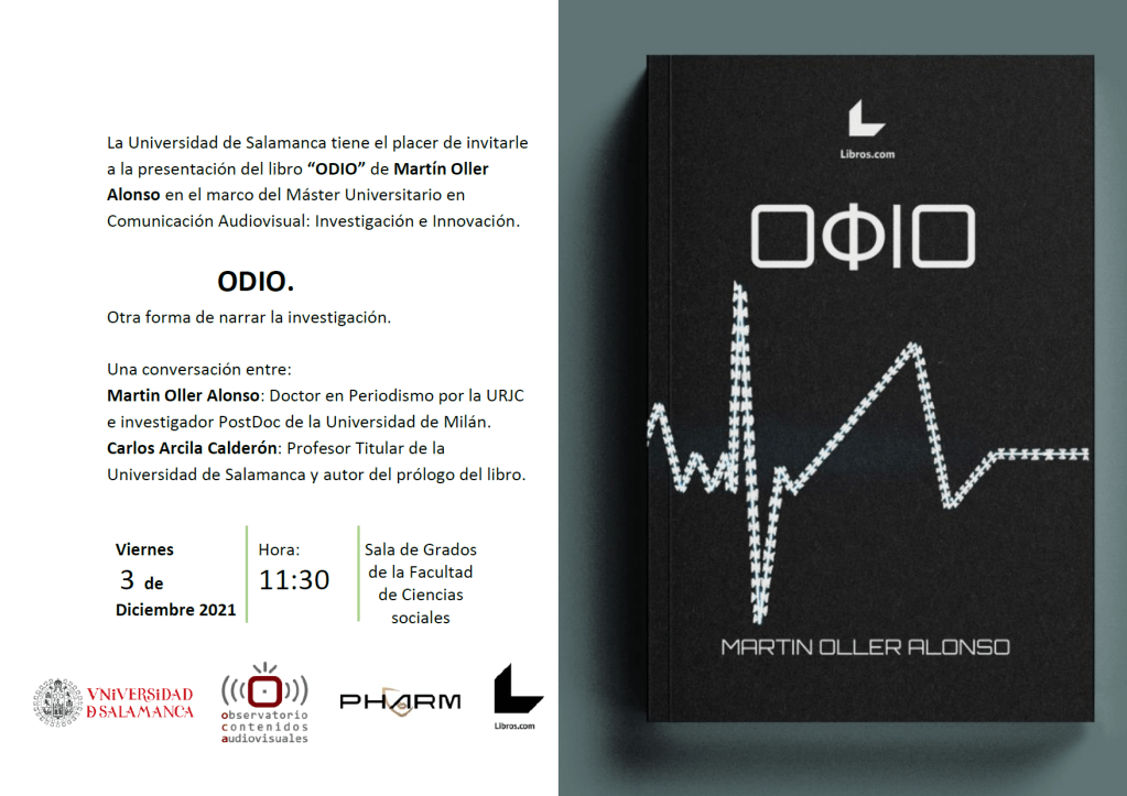 Como parte del maratón de presentaciones del libro «Odio» de la primera semana de diciembre incluimos a la Universidad de Salamanca en nuestra agenda. El próximo viernes 3 de diciembre a las 11h30 presento junto al Dr. Carlos Arcila Calderón el libro dentro del marco del Máster «Comunicación audiovisual: Investigación e innovación». En esta ocasión centraremos nuestra «discusión» en nuevos modelos de presentación y publicación de las investigaciones científicas.