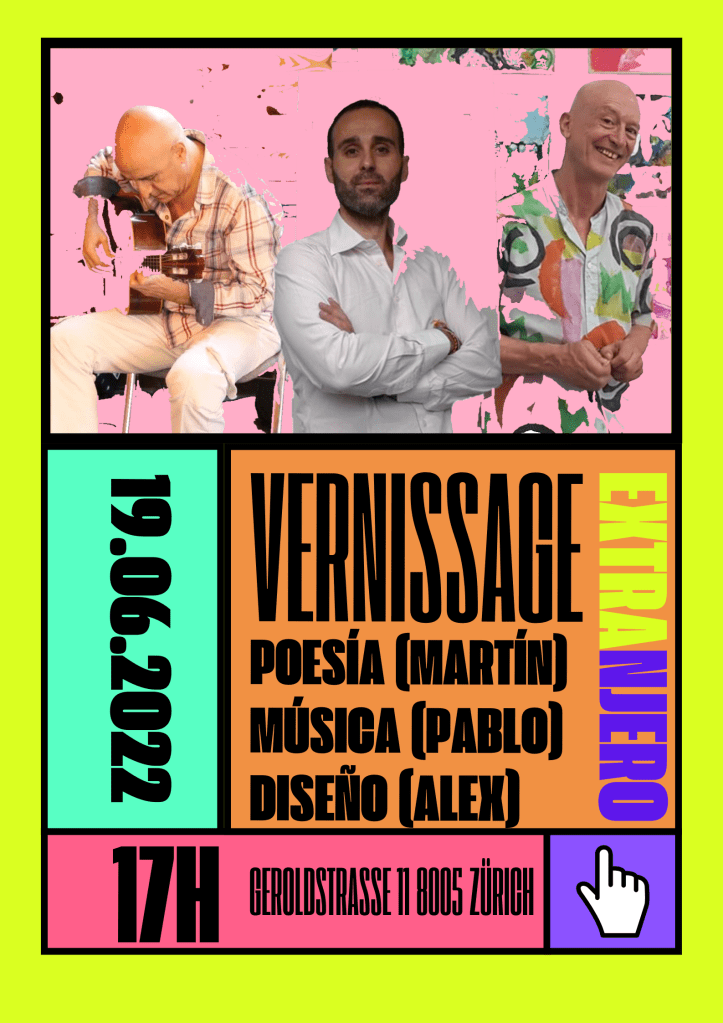 El domingo 19 de junio presentaremos la Vernissage poética «Extranjero» en el atelier de Alex Zwalen, ubicado en Geroldstrasse 11 8005 Zürich (Suiza). En este «performance a tres» hablaremos, discutiremos y, sobre todo, sentiremos la música de Pablo Miguez, las obras y diseños realizados en ese mismo momento por Alex Zwalen y un repertorio de mi poesía centrada en las personas que viajan por el mundo por diversos motivos. Esos denominados «extranjeros» en cualquier lugar y momento.