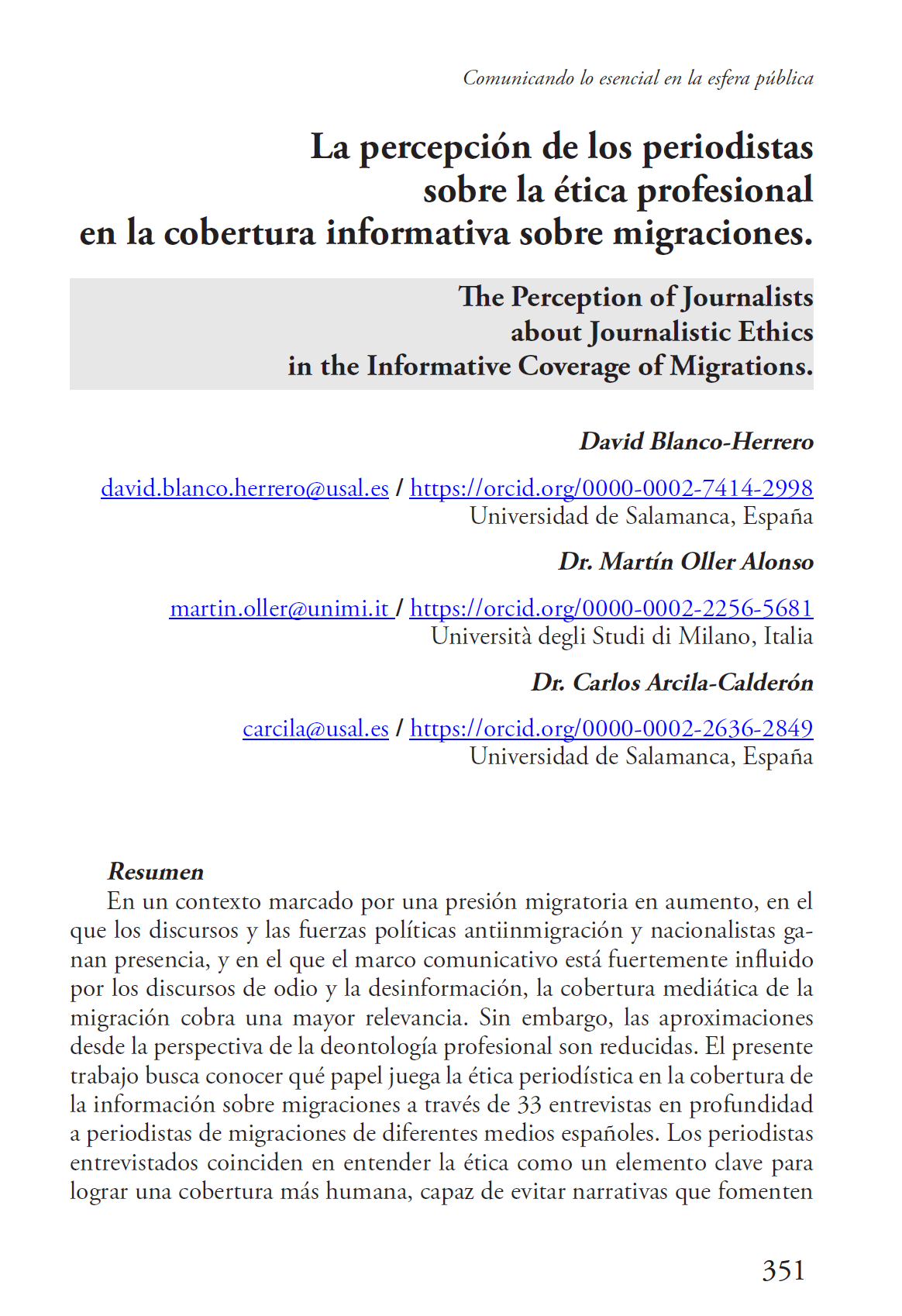 La primera semana de septiembre de 2022 fue publicado el libro «Comunicando lo esencial en la esfera pública. La Ética y la Deontología como garantía de la función social de los Media y sus profesionales» en la editorial Fragua (Madrid). Junto a David Blanco-Herrero y Carlos Arcila Calderón hemos participado con el capítulo «La percepción de los periodistas sobre la ética profesional en la cobertura informativa sobre migraciones». Un trabajo que tiene su origen en el proyecto PHARM (PREVENTING HATE AGAINST REFUGEES AND MIGRANTS).