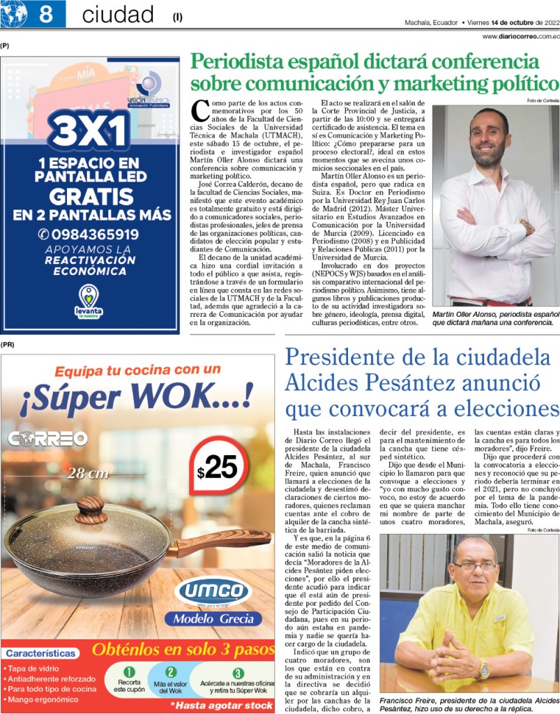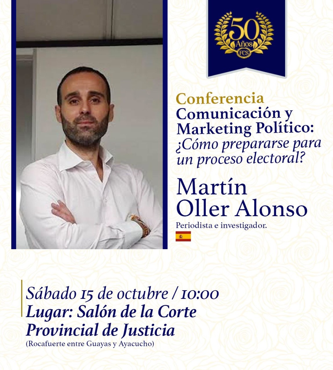 El sábado 15 de octubre presentaré la conferencia «Comunicación y marketing político: ¿Cómo prepararse para un proceso electoral?» en el Salón de la Corte Provincial de Justicia en Machala. En esta ocasión tendremos la oportunidad de mostrar una panorámica profunda y detallada del rol de los periodistas y los medios de comunicación en los acontecimientos políticos que acontecen en el Ecuador.