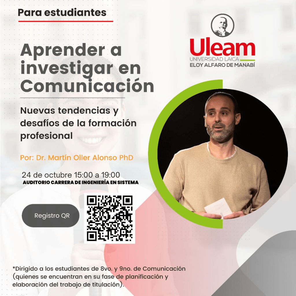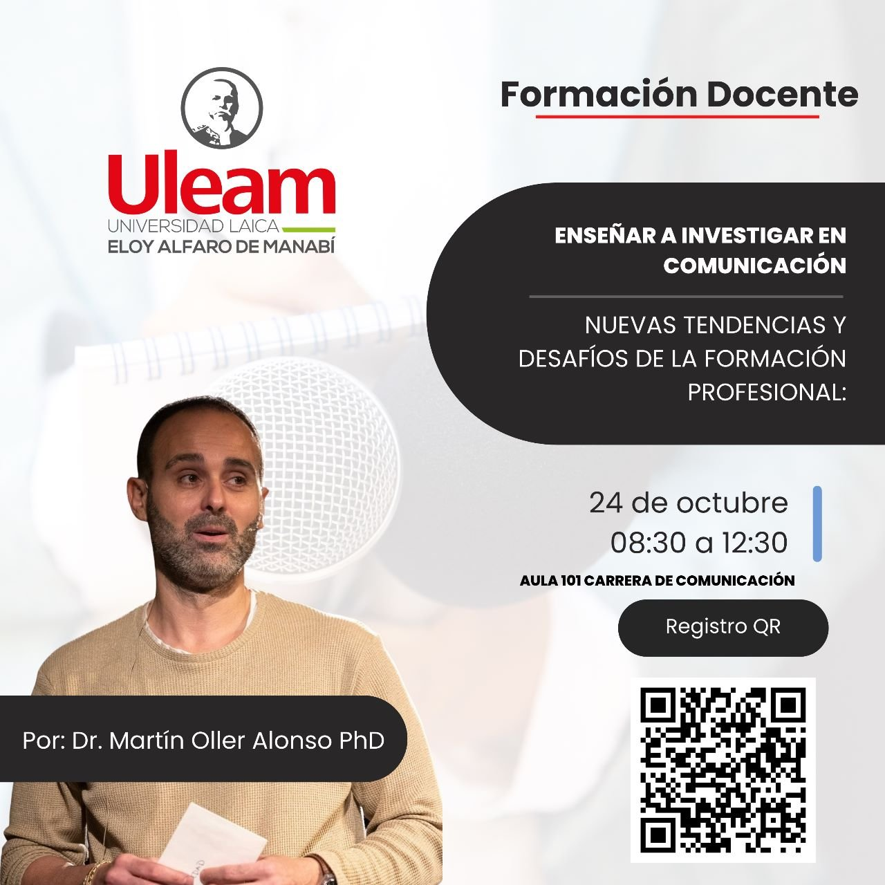 El lunes 24 de octubre de 8:30 a 12:30 horas estuve en la Universidad Laica «Eloy Alfaro» de Manabí (Ecuador) impartiendo dos cursos/taller de formación. El primero, dirigido a los docentes e investigadores de la ULEAM denininado «Enseñar a investigar en comunicación. Nuevas tendencias y desafíos de la formación profesional».