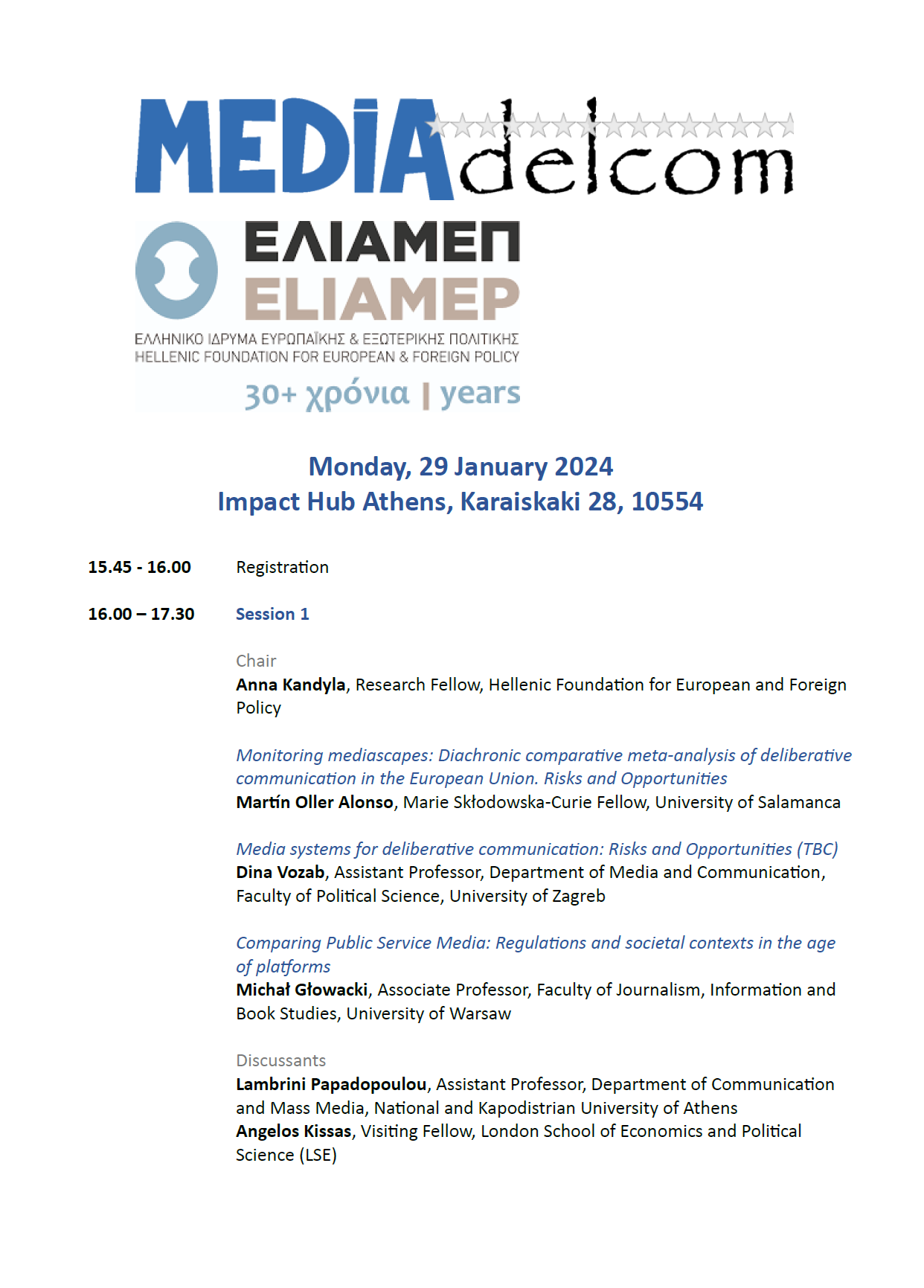 A heartfelt thank you to the Hellenic Foundation for European and Foreign Policy (ELIAMEP), and especially to Dr. Anna Kandyla and Dr. Evangelia Psychogiopoulou, for the invitation and the chance to contribute to the symposium’s focus on media monitoring alongside other significant comparative projects.